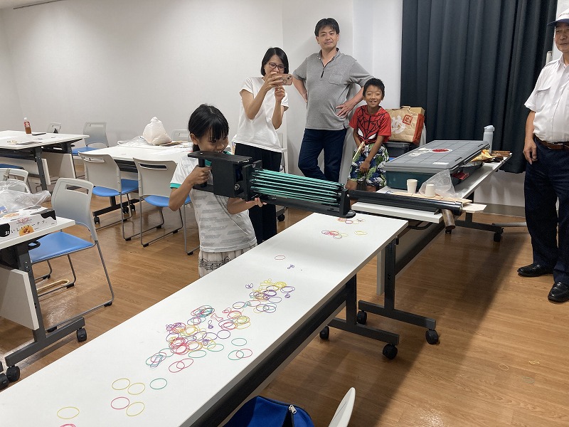最後は紙コップを的にした射撃大会で、子ども対抗・大人対抗・親子対抗と大盛り上がり!