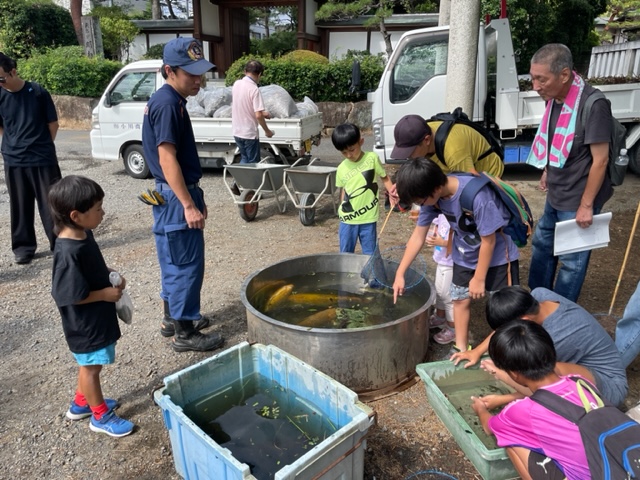 9月 15日9:00~正午、岩戸八幡神社にて「池の水全部抜く」イベントが行われました。岩戸親睦会の皆様はじめ、岩戸町会梢防部)などの多くの大人たち英毀池の水を抜きながら、草刈り、ポンプによる水抜き、鯉やなまず、小魚を池から盟(たらい)にうつしたり、消防車の大放水で池底を掃除。そのあと、綺麗な水が、そそがれ、あっという間に綺麗になりました。イベントには、多くの子どもが集まり、池の中に住む生き物の観察をしながら、池の中から出てくる生物に触れて賑わっていました。皆様大変お疲れ様でした。